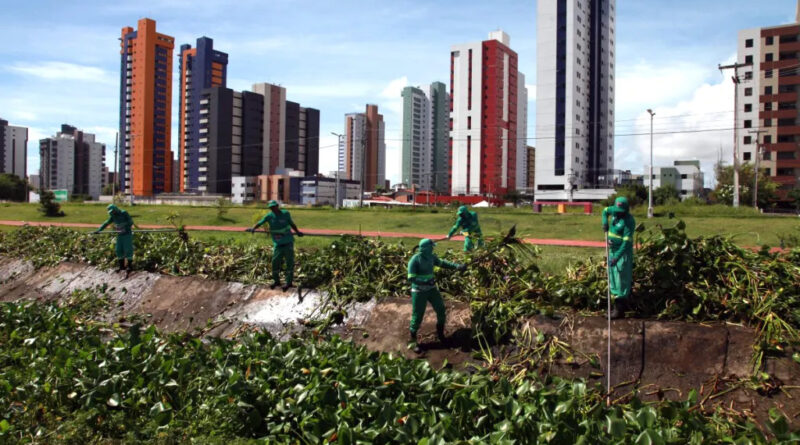 Agentes de limpeza urbana retiram excesso de vegetação e resíduos diversos do canal do Bessa