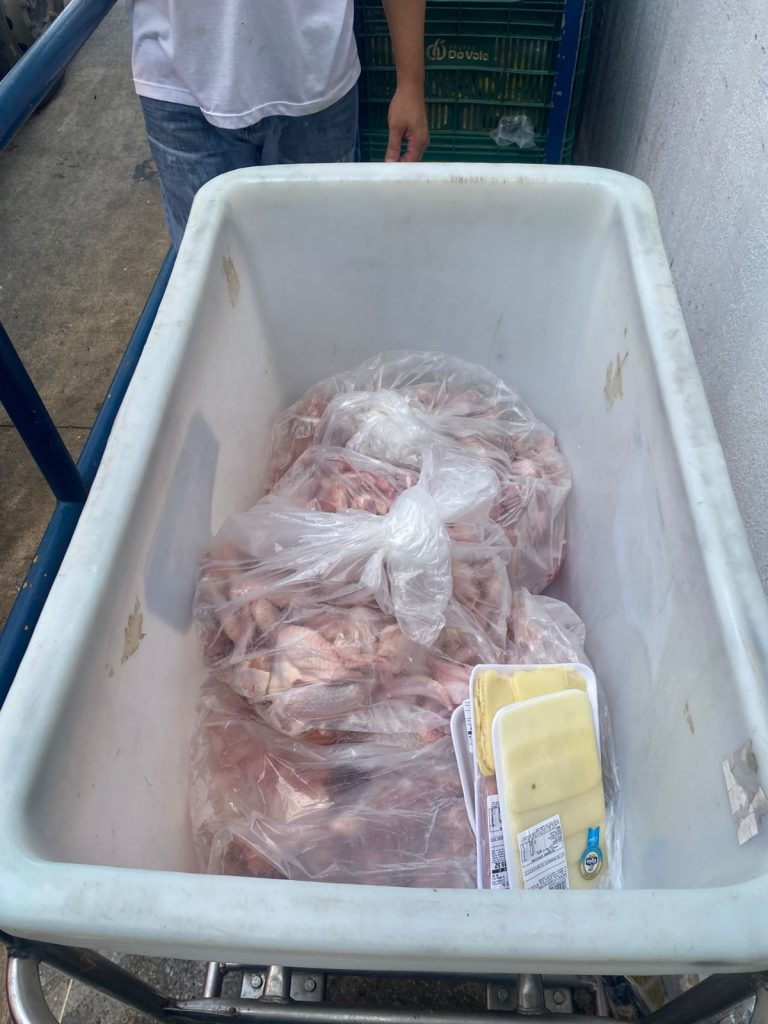 Os apreendidos – Além dos 56 quilos de frango (peito, coxa, coxinha da asa, meio da asa e asa) foram apreendidos croissant de queijo, kit queijo/presunto e queijo mussarela. Os produtos foram destruídos no local.