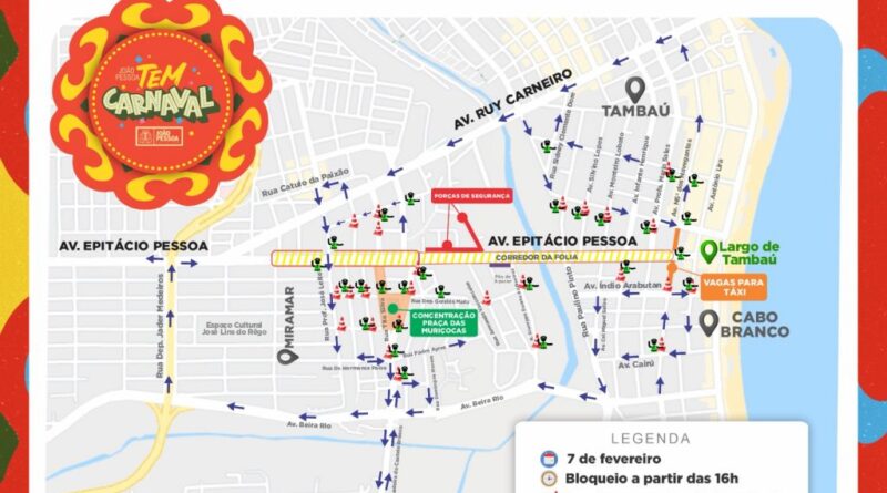 Bloqueio e desvios – A Via Folia, no trecho a partir da bifurcação com a Av. Rui Carneiro e Av. Tito Silva, será bloqueada no sentido Centro-Praia a partir das 10h, com as equipes operacionais orientando o posicionamento dos trios elétricos. E às 18h, com o aumento da demanda de foliões, dar-se início as intervenções e desvios para o bloqueio total da Via Folia, incluindo a Praça das Muriçocas, com proibição de acesso dos veículos particulares e do transporte coletivo.